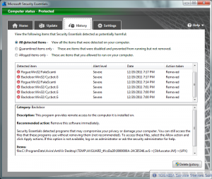 After installing MSE, and letting the definition update, I let it run. This was actually my first run of MSE on a system that was known to be infected, so this was a chance to actually see the program in action, and to judge its effectiveness on cleaning a system. It quickly detected the infected files and painlessly cleaned them. After rebooting, I noticed that the malware did not load up with the system: it seemed clean!